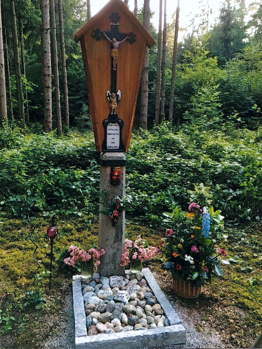 Nachdem das alte Kreuz durch einen umgestürzten Baum beschädigt wurde, hat es der "Feichtner Hartl" Leonhard Mittermaier aus Wang restauriert. Zu Füßen des Pestkreuzes liegen 271 Steine - für jedes Pestopfer ein Stein.